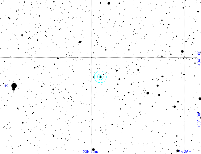 ■ 2010.06.16 02h25m JST 恒星 :HIP 116836 9.1等 赤経 23h 40m 50.894s,赤緯 +03°37' 37.78"(J2000) うお座 小惑星:(3097)Tacitus 17.4等 推定直径 25km 減光 :約 8.3等 継続時間 最長 1.4秒 掩蔽帯:東北,北海道 ランク:22ポイント ランク=減光の観測される可能性を示す指標。高ポイントほど確率が高い。 備考 :小型,小惑星の軌道精度が悪く誤差を大きく見る Star : HIP 116836 (mag 9.1) Asteroid : (3097)Tacitus (mag17.4)視野5度平方 The SKY 6 により作成