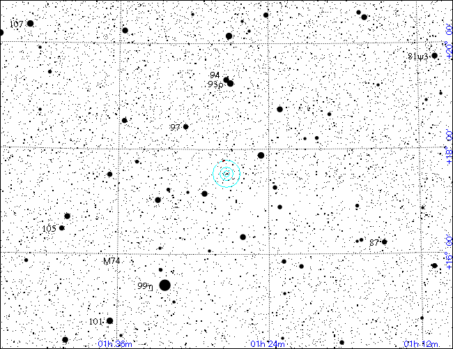 【好条件】 ■ 2014.01.07 21h33m JST 恒星 :TYC 1198-01291-1 9.8等 赤経 01h 26m 35.183s,赤緯 +17°27' 04.03"(J2000) うお座 小惑星:(983)Gunila 15.6等 推定直径 93km 減光 :約 5.8等 継続時間 最長 7.9秒 掩蔽帯:中部,関東 ランク:70ポイント ランク=減光の観測される可能性を示す指標。高ポイントほど確率が高い。 備考 :好条件 Star : TYC 1198-01291-1 (mag 9.8) Asteroid : (983)Gunila (mag15.6)視野5度平方 The SKY 6 により作成