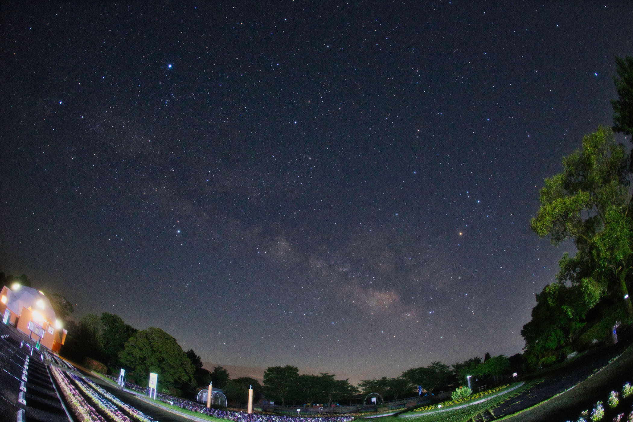 コメント: 撮影日:2024年5月28日 23時56分 絞り値:f/2.8 露出時間:シャッタースピード 10秒 感 度:ISO-3200 カメラ:Canon EOS 6D MarkU レンズ:焦点距離15mmの魚眼レンズ (三脚固定撮影) 撮影地:寺山いこいの広場 撮影者:後藤文雄 様