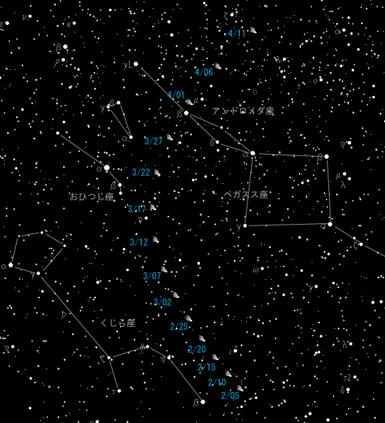 池谷-張 彗星の今後の動きです。くじら座,うお座,アンドロメダ座 と移動していきます。
