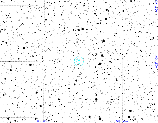 ■ 2013.03.07 20h34m JST 恒星 :TYC 1293-02702-1 11.6等 赤経 04h 56m 30.834s,赤緯 +20°59' 25.97"(J2000) おうし座 小惑星:(1702)Kalahari 16.6等 推定直径 38km 減光 :約 5.0等 継続時間 最長 2.2秒 掩蔽帯:北海道南部 ランク:51ポイント ランク=減光の観測される可能性を示す指標。高ポイントほど確率が高い。 備考 : Star : TYC 1293-02702-1 (mag11.6) Asteroid : (1702)Kalahari (mag16.6)視野5度平方 The SKY 6 により作成