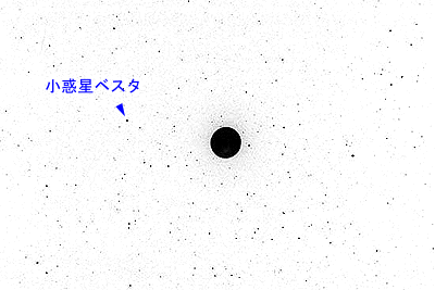 皆既中の星野 月の明るさにかき消されていた星々も、月食の間は一斉に輝きを取り戻します。 月の周りにはこんなにたくさんの星があったのですね。 恒星にまぎれて、明るい小惑星ベスタ(5.4等)がすぐ近くにいました。 撮影日時:2000年7月16日23時15分 露出5分 撮影地 :鹿児島県開聞町 カメラ/レンズ:264mm F4.4 PENTAX MX フィルム:Fuji SUPERIA400 撮影者:松下 優