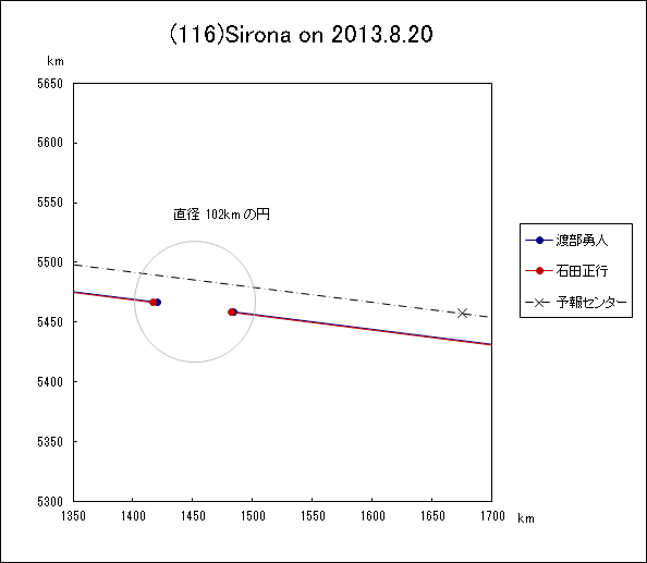 下図はせんだい宇宙館による整約計算の結果です。推定直径 102kmの小惑星に対して 63.2km と 66.2km の小惑星の弦が求められ、