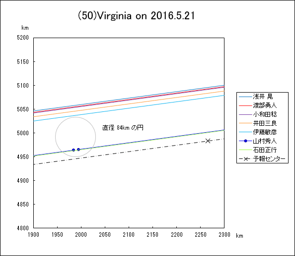 下図はせんだい宇宙館による整約計算の結果です。山村さんの観測からは推定直径 84kmの小惑星に対して観測から 10.8km の小惑星の弦が求められました。
